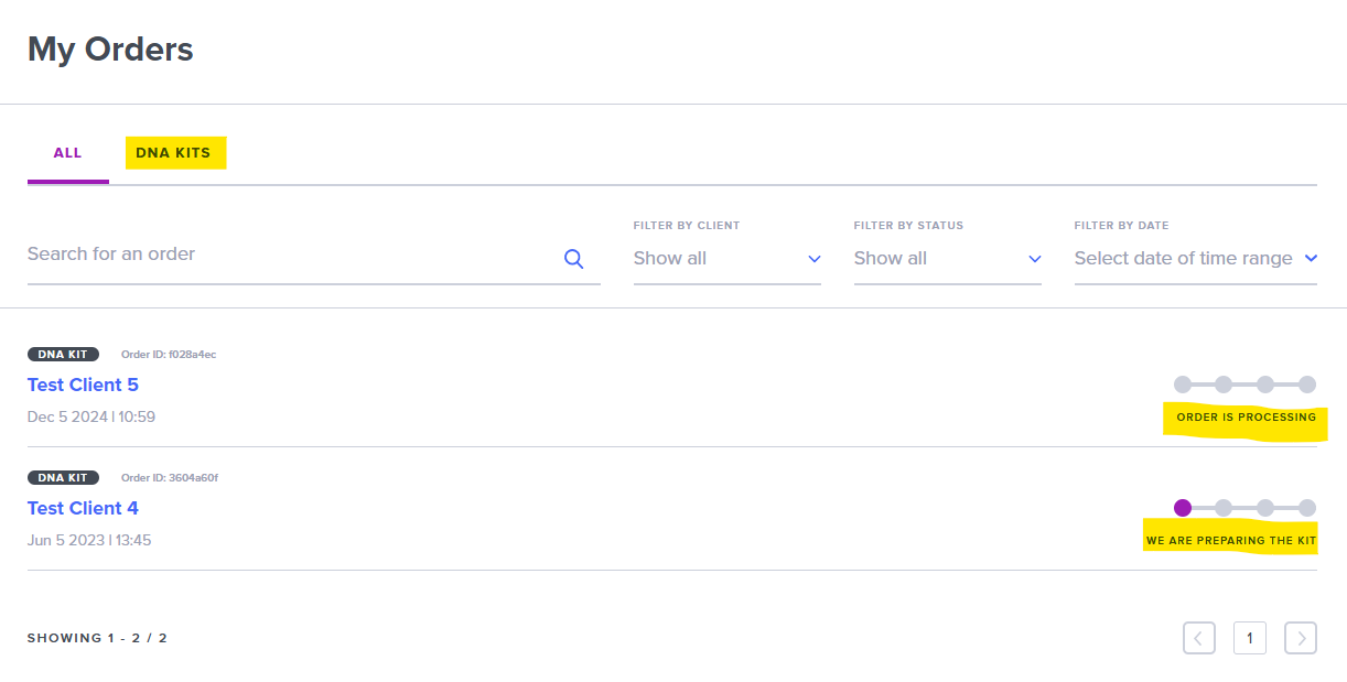 Need to check the status of a DNA kit order you placed for a client? You can find all order details directly from their profile.