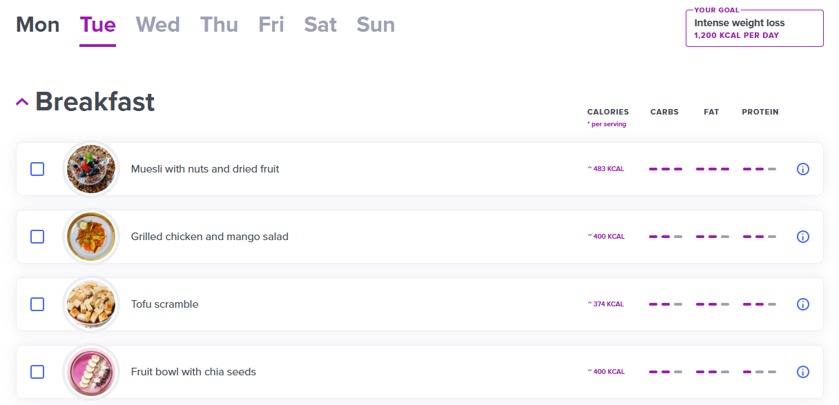 - See a running total of daily and weekly calories to help you align the plan with your client’s goals — such as intense weight loss, maintenance, or weight gain.