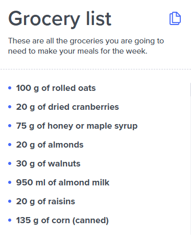 Once your weekly plan is set, see the Grocery List section to view all the ingredients your client will need for the week.