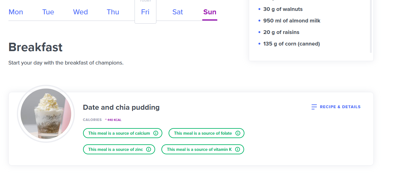 To view the recipe details, click the blue “i” icon next to the meal. This opens a full view with: