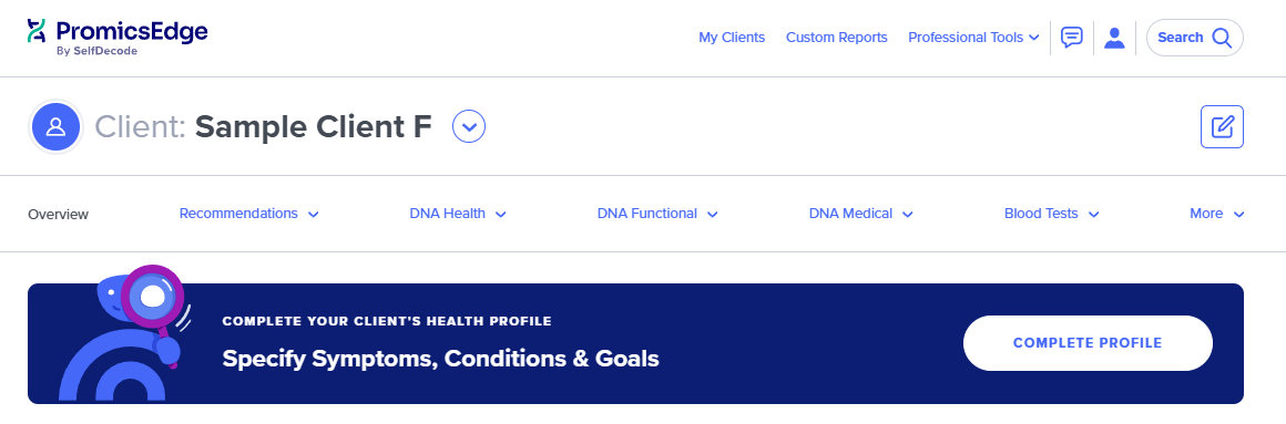 After adding a new client to SelfDecode Pro (PromicsEdge), you'll see a banner inviting you to complete their profile. This refers to lifestyle data collection, which is optional but highly recommended.