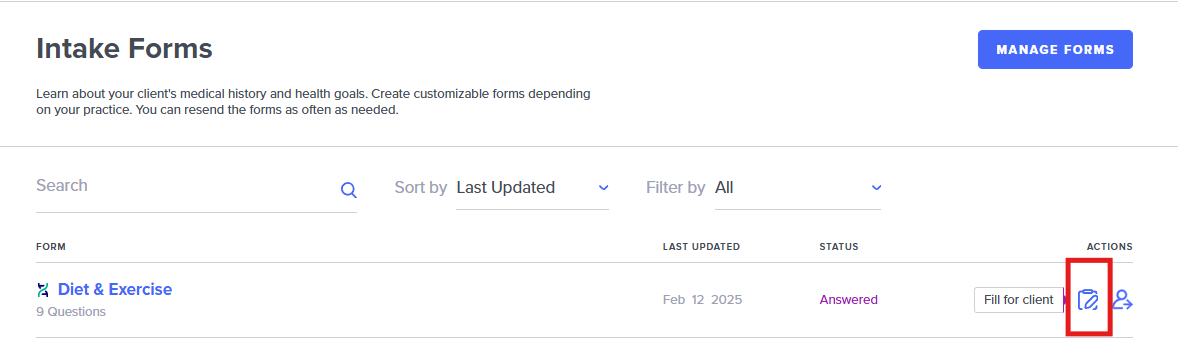 Q: Can I see which questionnaires are complete? A: Yes, in the Intake Form section, you can see the status of all questionnaires.