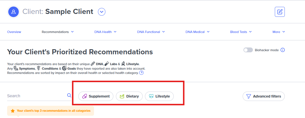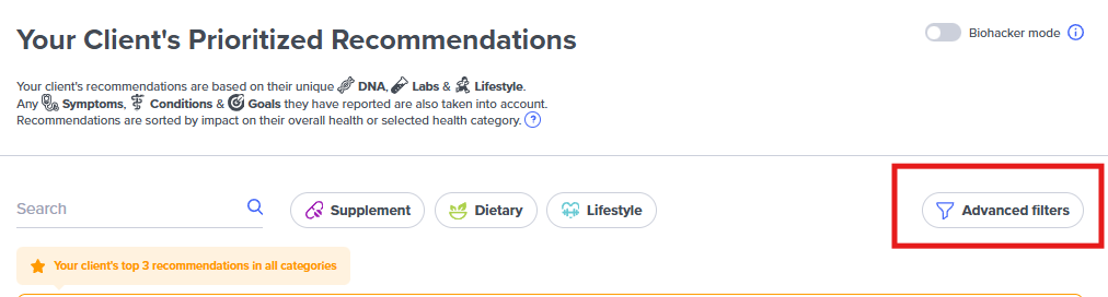 One way to filter their recommendations is to select the type of recommendation you want to see. Use the Supplement, Dietary, and Lifestyle filters to see only that type of recommendation: