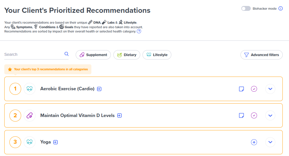 Recommendations are a curated, prioritized list of actionable interventions built specifically for each client. They combine genetic predispositions, uploaded lab results, intake forms, and lifestyle assessments into one place—so instead of reviewing multiple reports separately, you can start with a clear, data-driven action list right away.