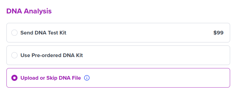 For the DNA kit option, do not select "Send a DNA Kit" — choose any other available option.